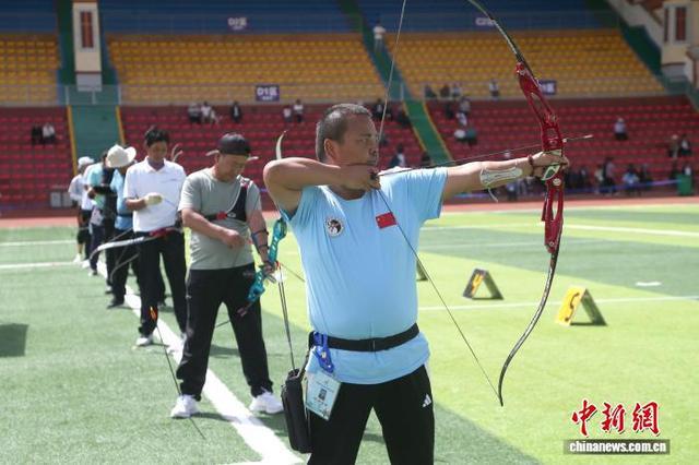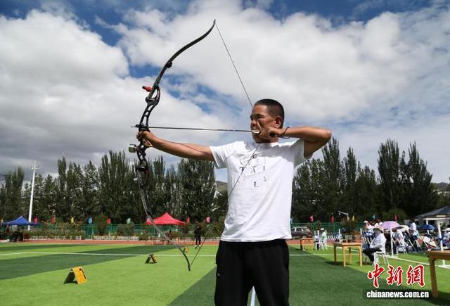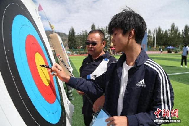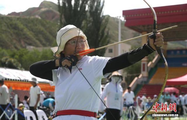 8月21日,青海省第八届少数民族传统体育运动会民族式射箭项目比赛在黄南藏族自治州尖扎县开赛。图为裁判员和运动员现场计算成绩。张忠苹 摄