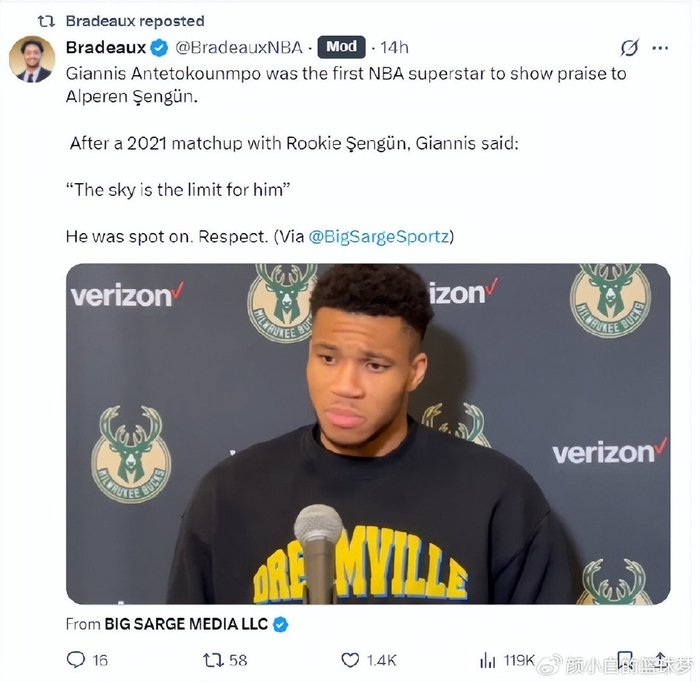 扬尼斯-阿德托昆博在此前的采访中谈论过申京,在2021年与新秀申京第一次对垒后,扬尼斯曾这样说道:“对申京而言,天空才是他的极限。”火记转推后表示扬尼斯说的完全正确。致敬。